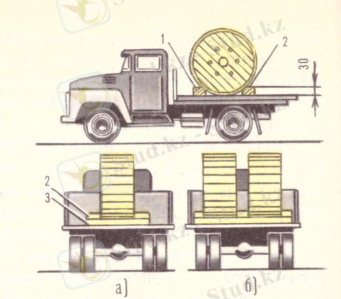 Кабельді тасымалдау барысында машинаның кузовына барабандар тұрақты және уақытша тірегіштермен бекітіледі. Тұрақты және уақытша тірегіштер барабандарды тиеп болғаннан кейін ұзақ мерзімді брусьялармен бекітіледі (1-сурет) .