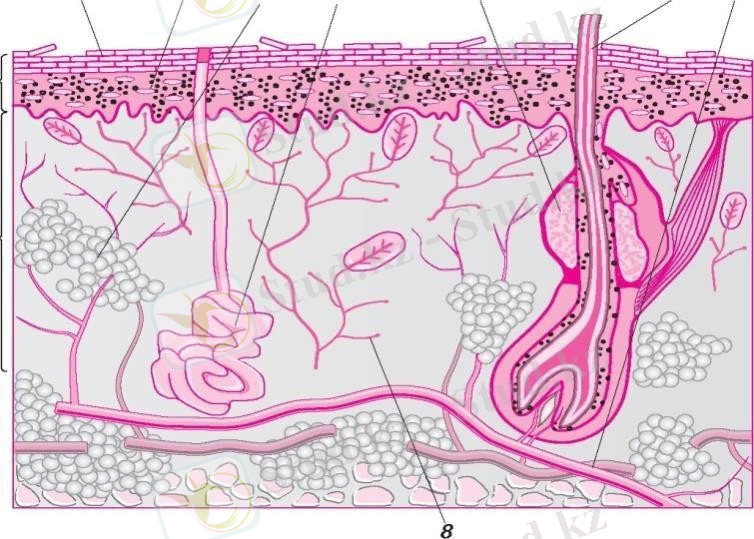 а - терінің сыртқы қабаты (эпидермис), б - терінің ішкі қабаты (дермати) ; 1 - қалың қабат; 2 - өсу қабаты; 3 - тері астындағы майлы тін; 4 - тер бездері; 5 - май бездері; 6 - шашты; 7 - қан тамырлары; 8 - сезімтал жүйкелік аяқталу