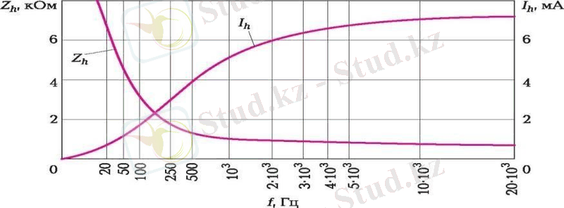 Сурет. 14. 4. Адам денесінің кедергісінен тәуелділігі және ток арқылы өтетін ток, 𝐼 ℎ қолданылған кернеу жиілігінде