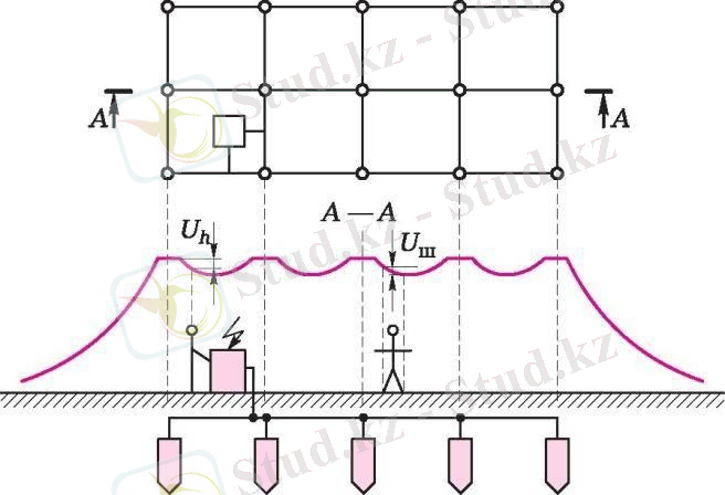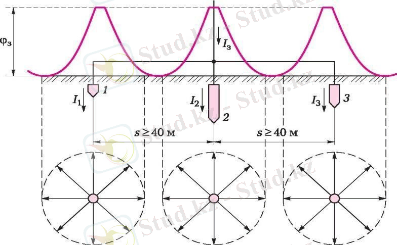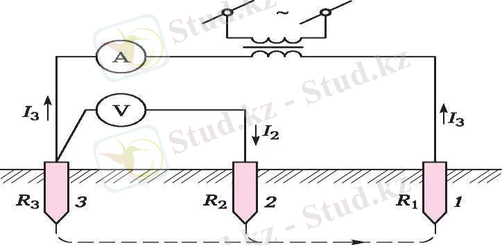 Жерге ағатын токты 1з, жерлендіргіш арқылы өлшеп 3, және жерлегңштің әлеуетін, кернеудің төмендеуін и кедергіге Я3 кедергі мәнін есептеуге болады