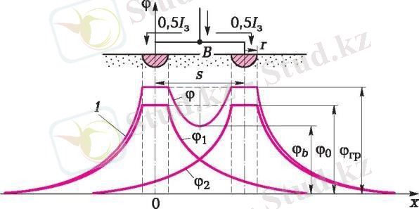 8. 5-де суретте екі бірдей жарты-сфералық электродтардан тұратын қарапайым топтық жерлендіретін электродтың әлеуетті қисық сызығы.