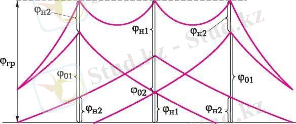 Сурет. 8. 6. Әлеуетті қисық топтық жерлендіру, бір түзуде орналасқан үш бірдей электродтан (1, 2, 3) :