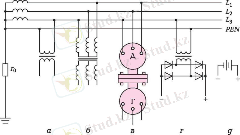 а - бір фазалы оқшаулау трансформаторы, б - үш фазалы оқшаулау трансформаторы, в - электр машинасының түрлендіргіші (мотор- генератор), г-түзеткіш және бір фазалы оқшаулау трансформаторы, д - аккумулятор