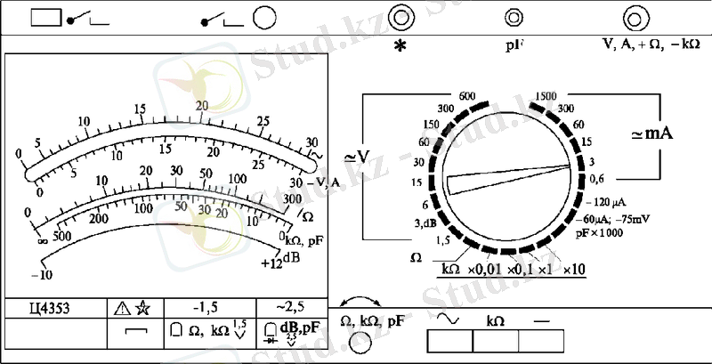 Есептерді шешу үлгілері 4. 1. Мысал. 4. 1 суретте Ц4353 мультиметрінің беткі жағы бейнеленген. Осы аспаппен өлшенетін параметрлер тізімін анықтау талап етіледі.Цифрлық мультиметрлердің өлшейтін параметрлер диапазоны кең, оларды қолдану барысында бөлік құны мен шкала коэффициентін анықтаудың қажеттілігі жоқ. Осыған сәйкес оператор субъективті қате жіберуі мүмкін емес. Алайда олардың құны аналогтық мультиметрлерге қарағанда жоғары.
