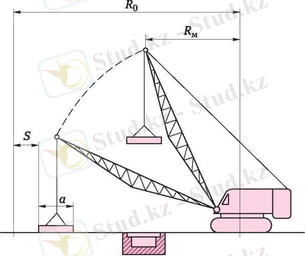 мұндағы R0 - қауіп аймағының радиусы; RM - кран ілмегінің максималды қашықтығы; a - бөліктің ұзындығы; S -ілмектің жүкті жеткізе алатын аралық қашықтығы.