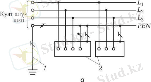 - TN-C-S жүйесімен, мұнда нөлдік қорғаныс және нөлдік жұмыс өткізгіштердің функциялары қуат көзінен бастап бір бөлікте бір өткізгішке біріктірілген (5. 3-сурет) ;