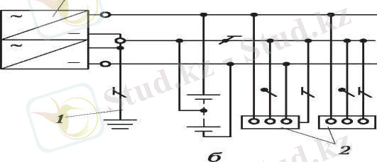 а - ауыспалыток, б, в - тұрақтыток: 1 - ауыспалыток қуат көзіне бейтарап жерлендіру; 1-1 - тұрақты ток көзіне жерлендіру шығару; 1-2