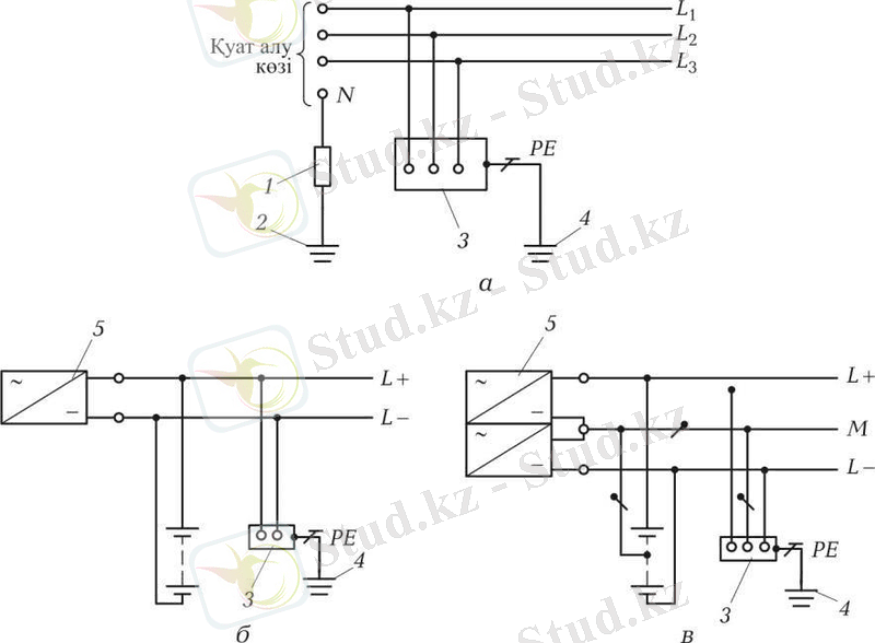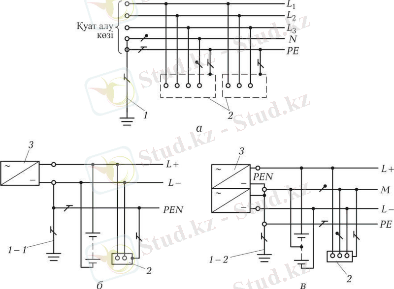 а - ауыспалы ток, б, в - тұрақты ток: 1 - қуат көзіне бейтарап жерлендіру қарсылығы (егер бар болса) ; 1. 1 - жерлендіру; 1. 2 - ашық өткізгіш бөліктер; 2 - жерлендіру құрылғысы; 3 - қуат алукөзі