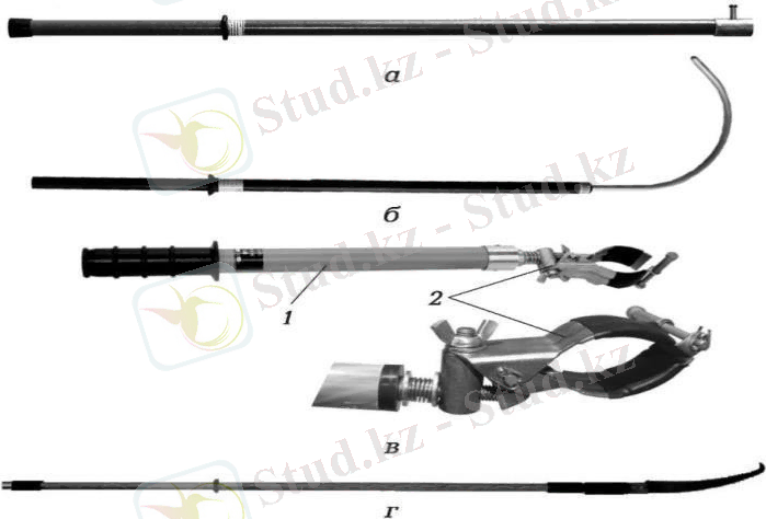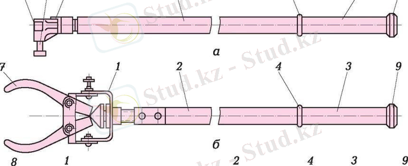 a - пайдалану, б - жөндеу (түтік ажыратқыштарды алу және орнату үшін), в - әмбебап: 1 - жұмыс бөлігі; 2 - оқшаулағыш бөлік; 3 - тұтқасы; 4 - ұстауды тоқтату (сақина) ; 5 - бір полюсті ажырғыштарды басқару үшін металды саусақ; 6 - кернеу индикаторын көрсету үшін бұрандалы тесік; 7 - ажыратқышты ұстауға арналған губкалар; 8 - құбырлы сақтандырғышты, оқшаулағыш төсеніштерді және т. с. с. ұстау үшін губкалар; 9 - жабылатын құрылғы