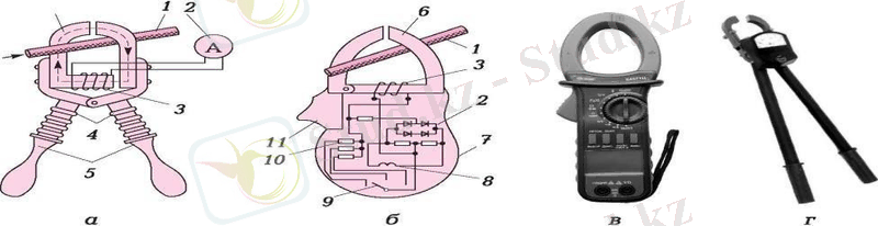 а, б - айнымалы ток (конструкциялық орындау нұсқалары) : 1 - ажыратылатын магниттік схема; 2 - ток өлшенетін өткізгіш; 3 - түзету көпірі; 4 - қайталама орам; 5 - өлшеу аспаптарының жиегі; 6 - өлшеуді қайта бөлуді ауыстыру; 7 - шунтерлік кедергі; 8 - магниттік тізбекті ашу тұтқышы; 9 - оқшаулағыш бөлік; 10 - шектеу сақинасы; 11 - тұтқа;