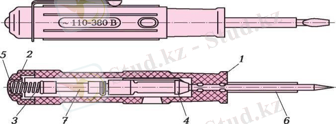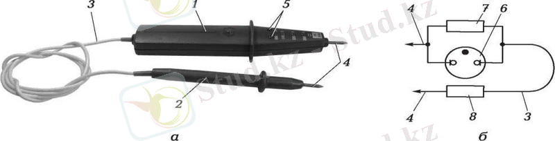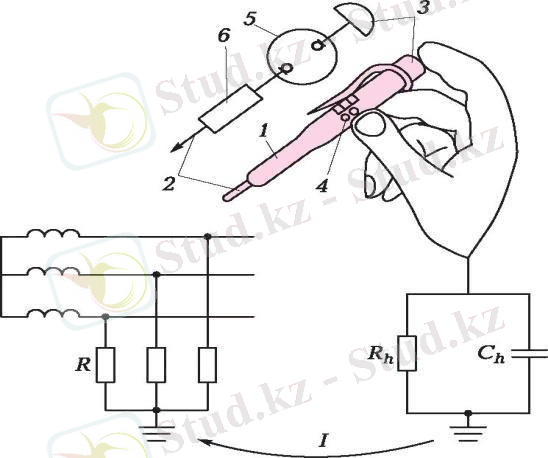 1 - индикатордың корпусы; 2 - байланыс ұшы; 3 - оператордың саусағымен жанасатын металл контактісі; 4 - индикатор шамы (корпусқа орнатылған неон шам) ; 5 - неонды шам (диаграммада) ; 6 - қосымша резистор, R - оқшаулау сымдарының жерге қатысты кедергісі; Rh - адам денесініңнегізге кедергісі және оның тұрған жерге ; Ch - адам денесінің жерге қатысты сыйымдылығы; I - көрсеткіш арқылы ағып жатқан ток