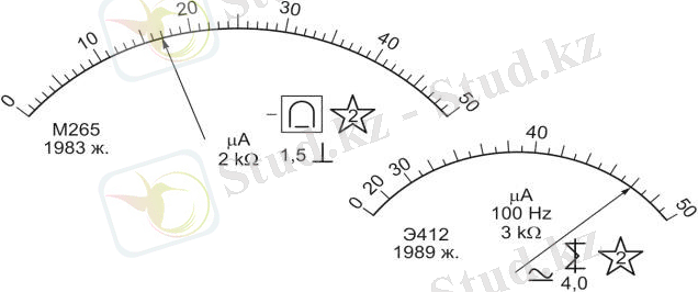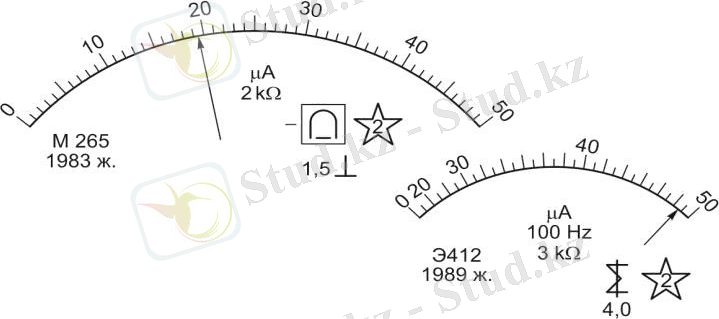 Мысал үшін 3. 1 суретте көрсетілген екі микроамперметрдің беткі жағында жазылған белгілерді алайық. Осы аспаптардың анықталған сипаттамаларын алдын-ала әзірленіп қойған 3. 1* кестесіне енгізіп отырамыз.