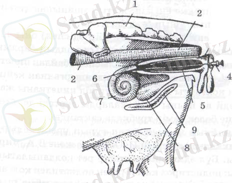 7 - жатыр мүйіздері; 8 - қуық; 9 - жамбас сүйектері