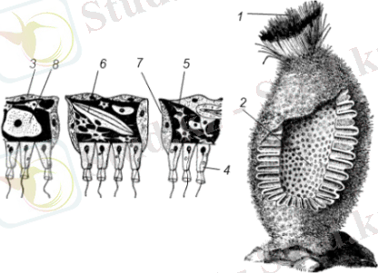 1. Пинакоциттер-губканың сыртын жғне пораларын қаптап жатқан клеткалар. Олар жалпақ жғне жиырылуға қабілетті.