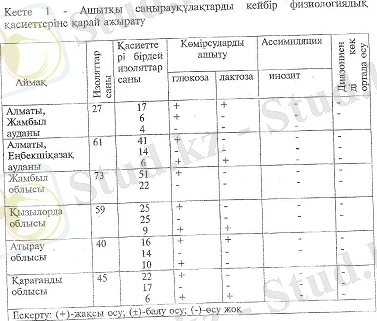 Шұбат үлгісінен, көмірсулардың лактозаны белсенді ашытатын ашытқы саңырауқұлақтардың 55 изоляты іріктелініп алынды: оның ішіндегі Алматы облысы Жамбыл ауданынан 17, Қызылорда облысынан 10 изолят, Атырау облысынан 16 изолят және 6 изолят Қарағанды облысынан. Ашытқы саңырауқұлақтардың клеткалары дөңгелек, элипс тәрізді, мөлшері 2, 0-6, 5 x 3, 0-8, 0 мкм элипс тәрізді, зат шынысында рудиментарлы мицелиялар түзеді. Этонолды ортада жақсы өсіп, NaCl жоғарғы концентрациясына төзімді келген. Көмірсулардан глюкозаны және лактозаны жақсы ашытады. Культуралдық және биохимиялық қасиеттерін зерттей келе, олар Kluyveromyces туысына жататыны анықталды. Изоляттардың басым бөлігі - 42 изолят Kl7yveromyces-8, 0- изолят түріне, изолят түріне, ал қалғандары түріне жақын деп есептелінді. . marxianus var lactis түріне, 5 изолят Kl7yveromyces-8, 0- изолят түріне, изолят түріне, ал қалғандары түріне жақын деп есептелінді. . marxianus var marxianus түріне, ал қалғандары Kl7yveromyces-8, 0- изолят түріне, изолят түріне, ал қалғандары түріне жақын деп есептелінді. . marxianus var bulgaricus түріне жақын деп есептелінді.