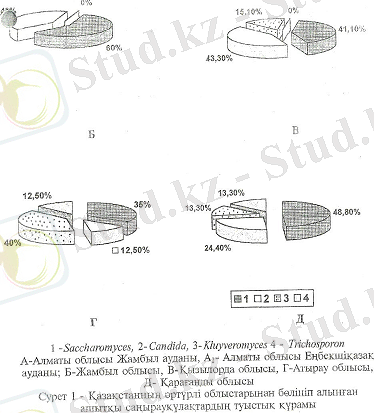 Басқа облыстардың шұбат үлгісінде Saccharomyces туысы басым, Жамбыл облысында - 60, Алматы облысының Еңбешіқазақ ауданында - блысында -ісінде озаны ашытатын ашытқы саңырауқұлақ түрлері мүлдем кезпейді. 61, 1. Бұлардың проценттік құрамы жағынан ұқсас екендігі анықталды. Ең аз кездескен алматы облысы Жамбыл ауданында - 15, 8 тең. Шұбат үлгілерінде, аскомицетті ашытқы саңырауқұлақтардан басқа аспорогенді ашытқы саңырауқұлақтар - Candida және Trichosporon туыстары кездесті. Олматы облысы жамбыл ауданының шұбат үлгісінде Trichosporon туысынан бір ғана штамм (3, 7) бөлініп алынып, ал Атырау облысынан 5 штамм (12, 5), Қарағанды облысынан 6 штамм (13, 5) бөлініп алынды. Жамбыл, Алматы (Еңбекшіқазақ ауданында) және Қызылорда облыстарында Trichosporon туысының түрлері кездеспейді. Шұбат үлгілерінде көп мөлшерде Candida туысының түрлері кездесті. Candida туысының түрлер Қазақстанның барлық облыстарында кездесті, әсіресе Қызылорда (43, 3), Жамбыл (40), Алматы облысы Еңбекшіқазақ (28, 8) ауданында, басым болды. (сурет 1)