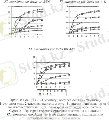 Kl7yveromyces-8, 0- изолят түріне, изолят түріне, ал қалғандары түріне жақын деп есептелінді. . marxianus var lactis шт. 11К және Kl7yveromyces-8, 0- изолят түріне, изолят түріне, ал қалғандары түріне жақын деп есептелінді. . marxianus var lactis шт. 4Ат культураларында СО2 жиналуы сүт сары суында 21, 3г/л, лактоза-пептонды ортада 20г/л аспаған. Көмірқышқыл газының ең көп бөлігі алғашқы 3 тәуліктің ішінде жиналған. Лактозаны ашытатын культураларда, CO2 ең аз бөлінуі сахароза-пептонды ортада байқалған.
