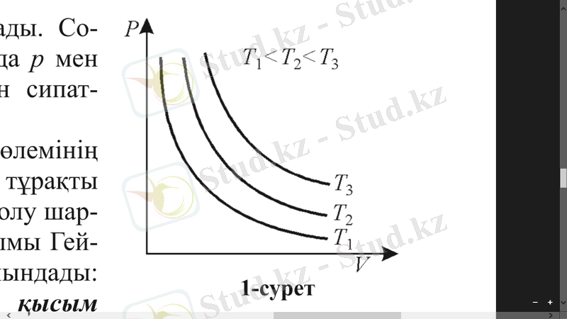 Бұл тəуелділікті изотерма деп аталатын гипербола қисығымен көрсетуге болады (1. 1 сурет) . Газ күйінің бір күйден екінші күйге тұрақты температурада өтуі изотермалық процесс деп аталады .