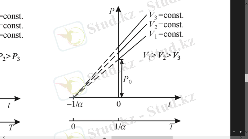 мұндағы: -газдардың 0 - тағы қысымы термиялық коэффициенті. Көлем тұрақты болғанда, - газ қысымының мен t тәуелділігі түзу сызықты және ол изохора деп аталады (1. 3 сурет) . Газ күйінің мұндай өзгеруін изохоралық процесс деп атайды. Зерттеудің нәтижелері газдардың термиялық коэффициенттері және бір-біріне шамалас екенін көрсетеді, яғни: