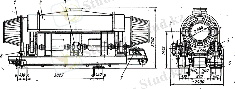 - барабан ернеуін желдетуге арналған диаметры барабаннан сорылатын ауа мөлшері 1800 D куб. м/с (мұнда D-барабан айналасына енгізілген диаметрі, м) және ауа жылдамдығын 16-24 м/с шамасында қамтамасыз етіліп таңдалатын бос шетмойындардан;