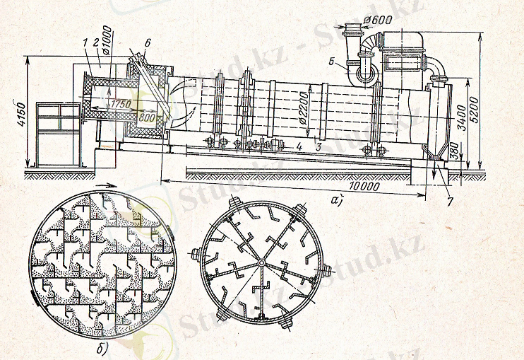 1 - газ немесе қара майдағы оттығы; 2 - көмірдегі оттық габариті; 3 - барабан; 4 - привод; 5 - түтінді сорғыш; 6 - құмды жүктеуші; 7 - құмның шығуы.