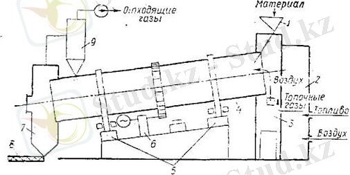 Сусымалы және ұсақ кесек құрылыс материалдарын кептіру үшін барабан кептіргші қондырғыларын барынша үнемді әрі сенімді пайдалануда қолданылады (1. 1-сурет) . 2 оттыққа - отын, ал үрлеу желдеткішімен жануға қажетті ауа беріледі. Араластыру камерасындағы оттық газдарды 3 есептік параметрлерге дейін сыртқы ауамен қоспалайды және кептіргіш қондырғысына береді. Барабан кептіргіш диаметрі 1 . . . 3, 5 м және ұзындығы 5 . . . 27 м, роликті тіректерге 5 қарай 4. . 6 0 бұрышпен орналасқан және, айналу жиілігі минутына 0, 5 . . . 8 айналым электр жетегімен 6 айналатын, болат барабан болып табылады. Барабаннның бойлық орналасуы барабанды бекітілген және сонымен бірге роликті тіректе айналатын бандажға кедергі жасайды. Барабанды айнладыру кезінде 1 тиеу шанабынан алынған материал 7 ақырғы камераға айналады, одан 8 конвейерге жөнелтіледі.