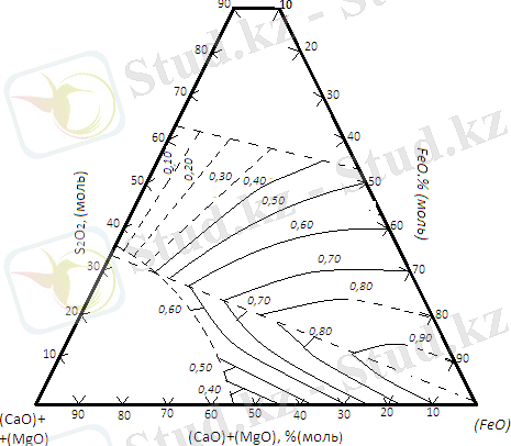 арқылы бағалағанда аламыз (1-сурет) . Активтік не есептеледі, не эксперимент арқылы анықталды. Темір шала тотығының FeO изоактивтік түзулері (5-сурет) (CaO+MgO) -SiO