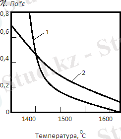 3 сурет - Тұтқырлықтың температураға тәуелділігі:1- негіздік шлактар 2-қышқылдық шлактар.