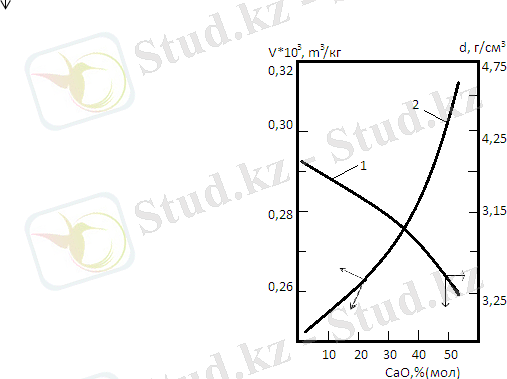 4 сурет - FeO-ны CaO-ға алмастырудың CaO-FeO-SiO 2 балқымасының тығыздығы мен меншікті көлеміне әсері