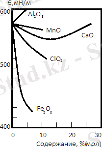 Оксидтер ерітінділерінде беттік қабат басым көпшілігінде O 2- иондарымен толтырылған, өйткені бұл иондардың өлшемі ең үлкен, ал өрісі әлсіз. Шлактың беттік керілісі оның құрамына тәуелді (11-сурет) . Бөлшектер арасында әрекеттесу қанша үлкен болса, соншама беттік керіліс те үлкен болады. Ерітінділерді , не аниондардың болуы ны төмендетеді. Күрделі аниондардың катиондармен байланысы әлсіреген, сондықтан олар жоғары қабаттарға ығысады. FeO-SiO 2 -MnO немесе FeO-SiO 2 -CaO ерітінділерінде FeO- ны Mn не CaO- ға айырбастау беттік керілістің өзгеруіне әкелмейді, ал SiO 2 мөлшері өссе төмендейді. Бұлай болудың себебі :