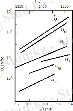 Диффузия. Балқыған шлактардағы элементтердің диффузия процесі (масса тасымалдау) болатты балқыту технологиясына және зиянды қоспалардан тазалау процесіне елеулі әсер етеді. Сұйық шлактағы диффузия жылдамдығы металл балқымаларындағы жылдамдықтан бір-екі дәреже төмен болады. Оттегі, кальций, күкірт, алюминий және кремнийдің радиоактивті изотоптарының CaO-SiO 2 -Al 2 O 3 жүйесінің балқымасындағы диффузия коэффициенттерінің әр түрлі температурадағы мәндері 12-суретте көрсетілген.