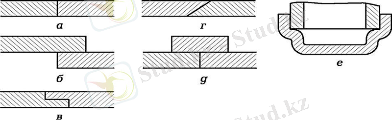 2. 1. сурет. Дəнекерлі жіктердің түрлері: a - түзу сызық; б - қабаттасу; в-сатылы аралық; г - тікелей түпкілікті аяқтау; д- қабықшалы аралық; e - кең