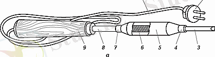 a - тікелей желі: 1 - электр сым; 2 - электрлік штепсель; 3 - жұмыс бөлімі; 4, 7 - қысқыштар; 5 - корпус; 6 - қыздыру элементі; 8 - білік;