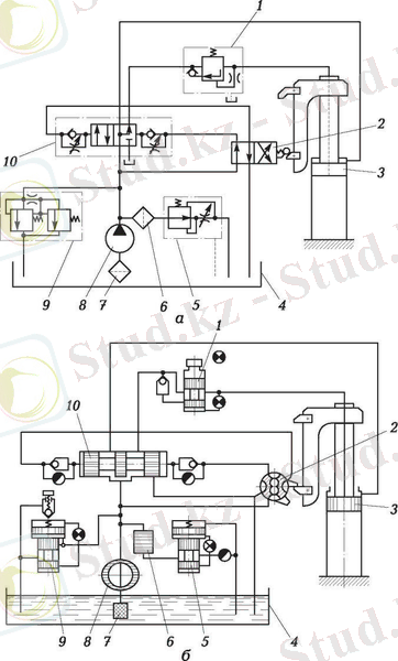 - сурет. Функциональналды (а) жəне принципиалды (б) гидравликалық сызбалар: 1, 10 - тиісінше қысым мен кері бөліп таратқыш; 2 - бақылау краны; 3