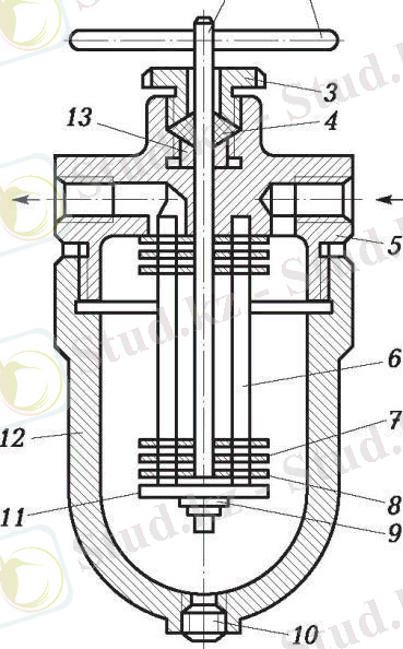 1 - ось; 2 - тұтқа; 3 -қысу сомыны; 4 -тығыздау сақинасы; 5 - қақпақ; 6 -тұтастырғыш; 7, 8 - сүзгілеу элементтері; 9 - сомын; 10 - ағызғыш тығыны; 11 -қысу дискі; 12 - тұрқы; 13 -тірек шайба (таяныш)