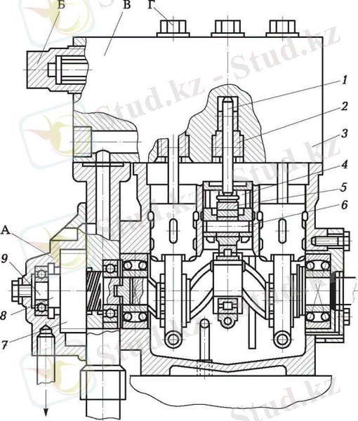 1 - поршень; 2 - тығын; 3 - сорғы тұрқысы; 4 - крейцкопф; 5 - шатун; 6 - саусақ; 7 - тісдөңгелек; 8 - ось; 9 - иінді білік; A - төмен қысымды бөлігі; B - ауыстыратын бөліп таратқыш; B - жоғары қысымды бөлігі; D - клапан қорапшасы