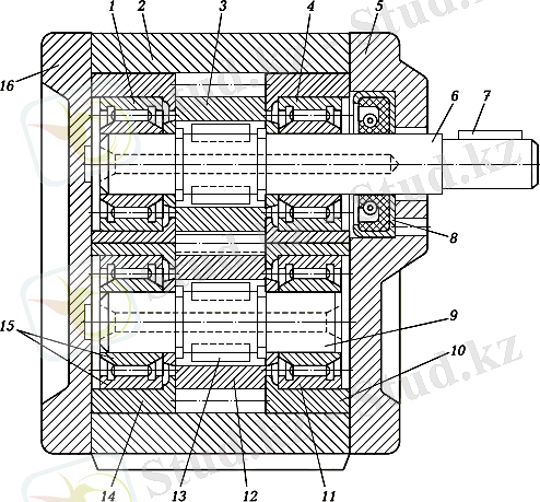 1, 4, 11, 15 - инелі мойынтіректер; 2 - тұрқы; 3, 12 - тісті доңғалақтар;