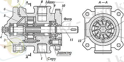 сору жəне айдау камералары; 5 - басыңқы ротор; 6, 8 - қысу жəне тіреу төлкесі; 7 - тұрқы; 11, 13 - жетектеген ротордың жүк түсіретін поршеньдері; 12 - басыңқы ротордыңжүк түсіретін поршеньдері