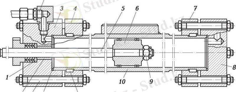 1 - майұстағышты тығыздағыш; 2 - жалғастық; 3, 8 - қақпақтар; 4, 7 - фланецтер; 5 - шток; 6 - поршень; 9 - сомын; 10 - қауыз; 11 - кілтек; 12 - тығыздағыш сақина; 13 - түйреуіш; 14 - төлке