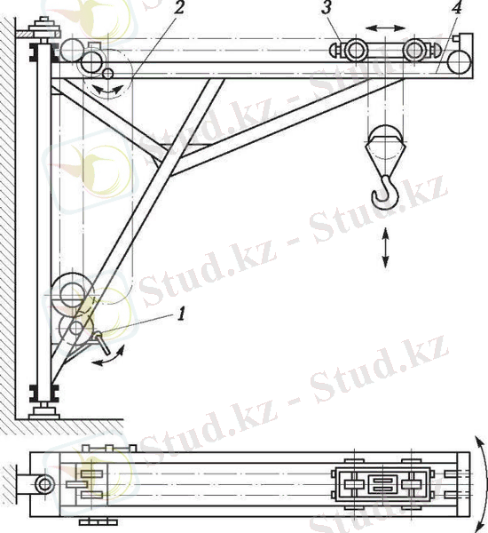Консолды қыстырма айналатын кран (9. 1 сурет) өндірістік бөлменің едені мен қабырғасына орнатылатын арнайы таған - қарнаққа орнатылады. Бұндай жабдықтың негізгі түйіні жүктің кқтерілуін қамтамасыз ететін қол жетекті жүкарба 1 болып табылады. Кран жебесі шығымының өзгеруі арбаның 3 көлденең арқалық бағыттаушылары бойынша қозғалысының арқасында жүзеге асырылады. Арбаның 3 қозғалуы қолмен арқан 4 тарту арқылы жасалады. Арқан шынжыр көмегімен қолмен бұрылатын шынжырлы доңғалаққа 2 қосылған.