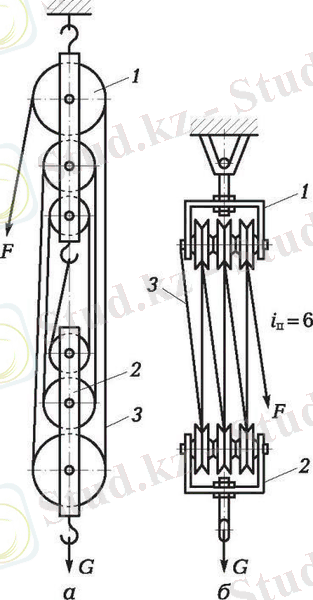 1, 2 - тиісті тұрақты жəне жылжымалы блок; 3 - иілгіш жетеккүш органы; G - жүк массасы; F - қолданылатын күш; /п - полиспасттың еселігі
