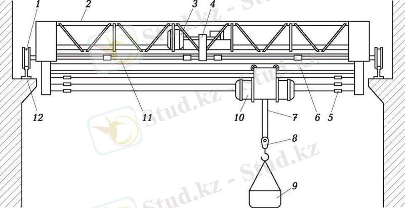 4 - редуктор; 5 - қуатты электрлі жетек; 6 - қоставрлы арқалық; 7 - сым арқан; 8 - жүк ілгек; 9 - жүк; 10 - тельфер; 11 - трансмиссиялық вал; 12 - рельстер