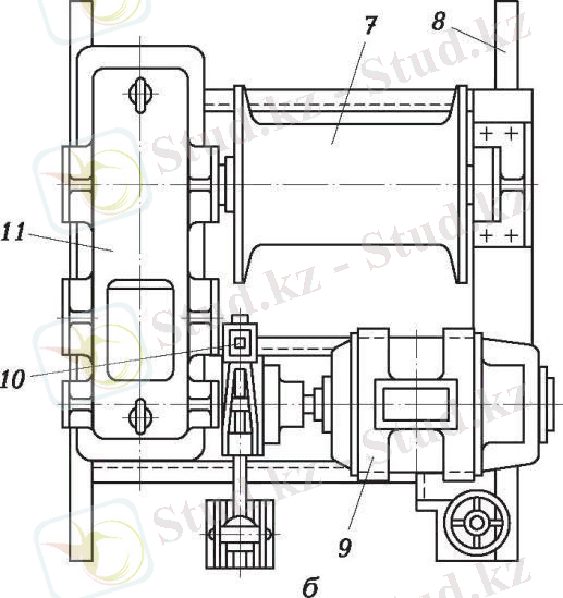 1- табан; 2 - жетеккүш; 3, 7 - барабандар; 4 - тістік берілім; 5 - тұтқа; 6 - тіреуіш механизмі; 8 - жақтау; 9 - электрлік қозғағыш; 10 - тежеуіш; 11 - редуктор