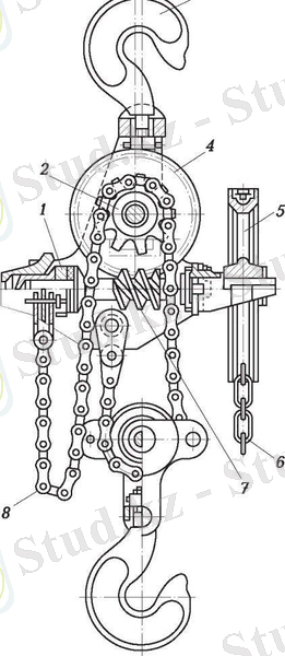1 - тежеуіш; 2 - жұлдызша; 3 - ілгек; 4 - бұрамдық доңғалақ; 5 - жетекті доңғалақ; 6 - жетекші шынжыр; 7 - бұрамдық; 8 - тілімді жүк шынжыры