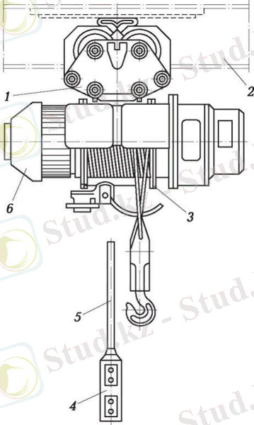 1 -арба; 2 - монорельтік бағыт; 3 - арқанды барабан; 4 - басқару пульты; 5 - иілгіш сым; 6 - электр қозғалтқышы
