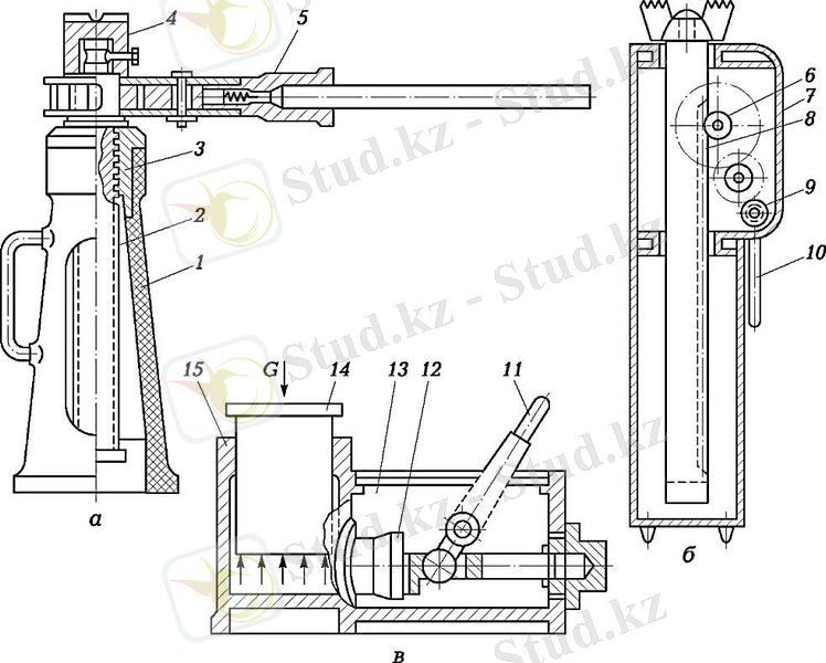 5, 10 - тұтқалар; 6, 9 - тістік доңғалақтар; 8 - тістік төрткілдеші; 11 - иінтірек; 12 - плунжерлік сорап; 13 - гидравликалық сұйықтық резервуары; 14 - мікбас; 15 - цилиндр; G - жүк массасы