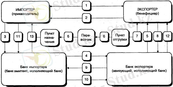 тексеруден өткеннен кейін экспорттаушы банк эмитент-банкке төлем үшін құжаттарды (және егер олар аккредитивтің талаптары оларды ұсыну үшін қарастырса) жібереді (9) ;
