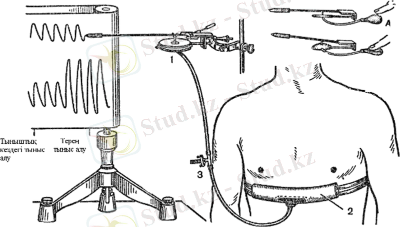 1-Марей капсуласы; 2-Марей пневмографы; 3-қысқышы бар тройник; 4-ауалық берілу принципі