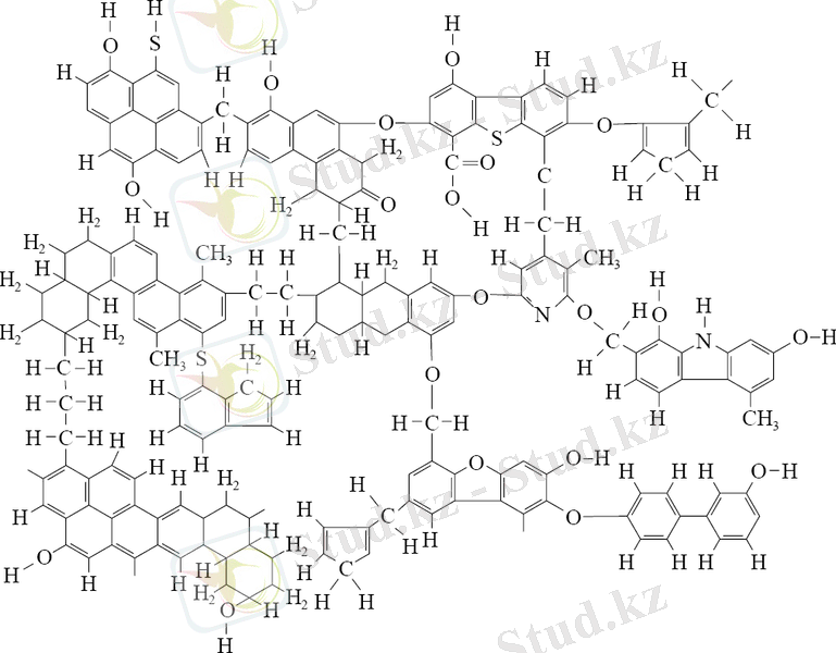 1 суретте көмірдің органикалық массасыны құрлымының үлгісі көрсетілген [28] . Көмірдің шынайы молекуласында мұндай фрагменттер мыңнан асады.