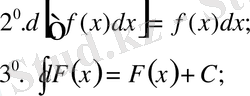 қасиеттері оның қасиеттері деп аталады. Бұларды біріншісі функциялар қосындысының анықталмаған интегралы сол функциялардан жеке-жеке алынған анықталмаған интегралдар қосындысына тең екенін көрсетеді, ал екіншісі тұрақты көбейткішті интеграл алдына шығаруға болатынын көрсетеді.